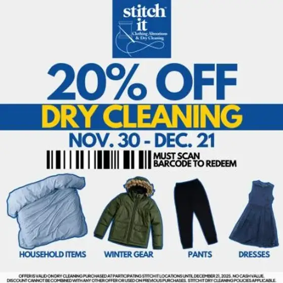 Give your clothing the winter refresh they deserve! Visit Stitch It between November 30 to December 21 and save 20% off dry cleaning! Don't miss out!